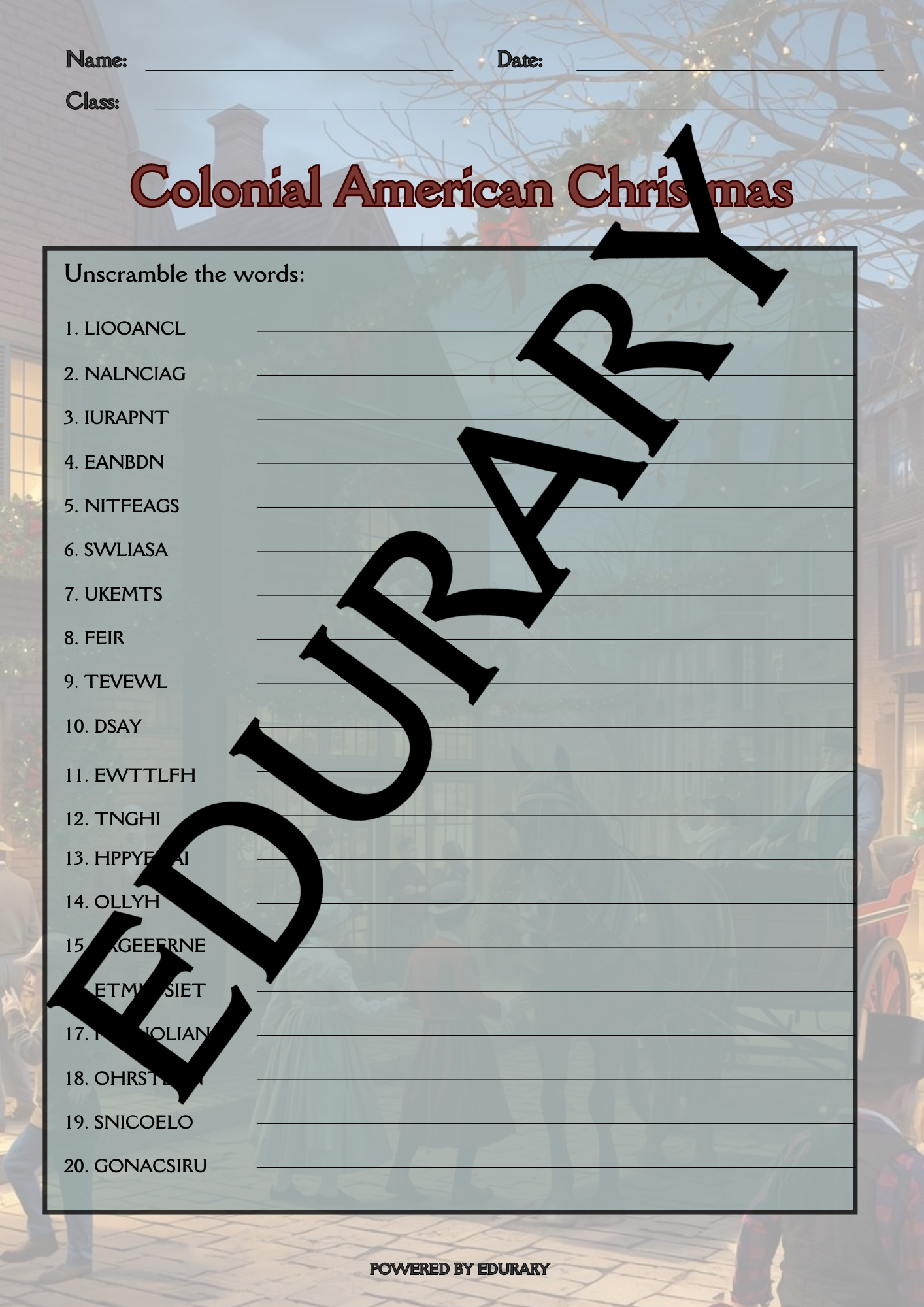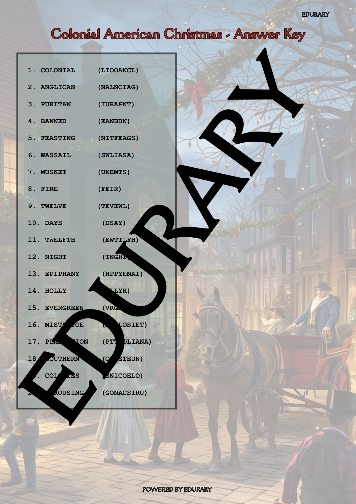 Words reflecting the varied, often subdued, and adult-focused nature of Christmas in the American colonies, featuring traditional English feasting and Southern revelry alongside Puritan abstinence.