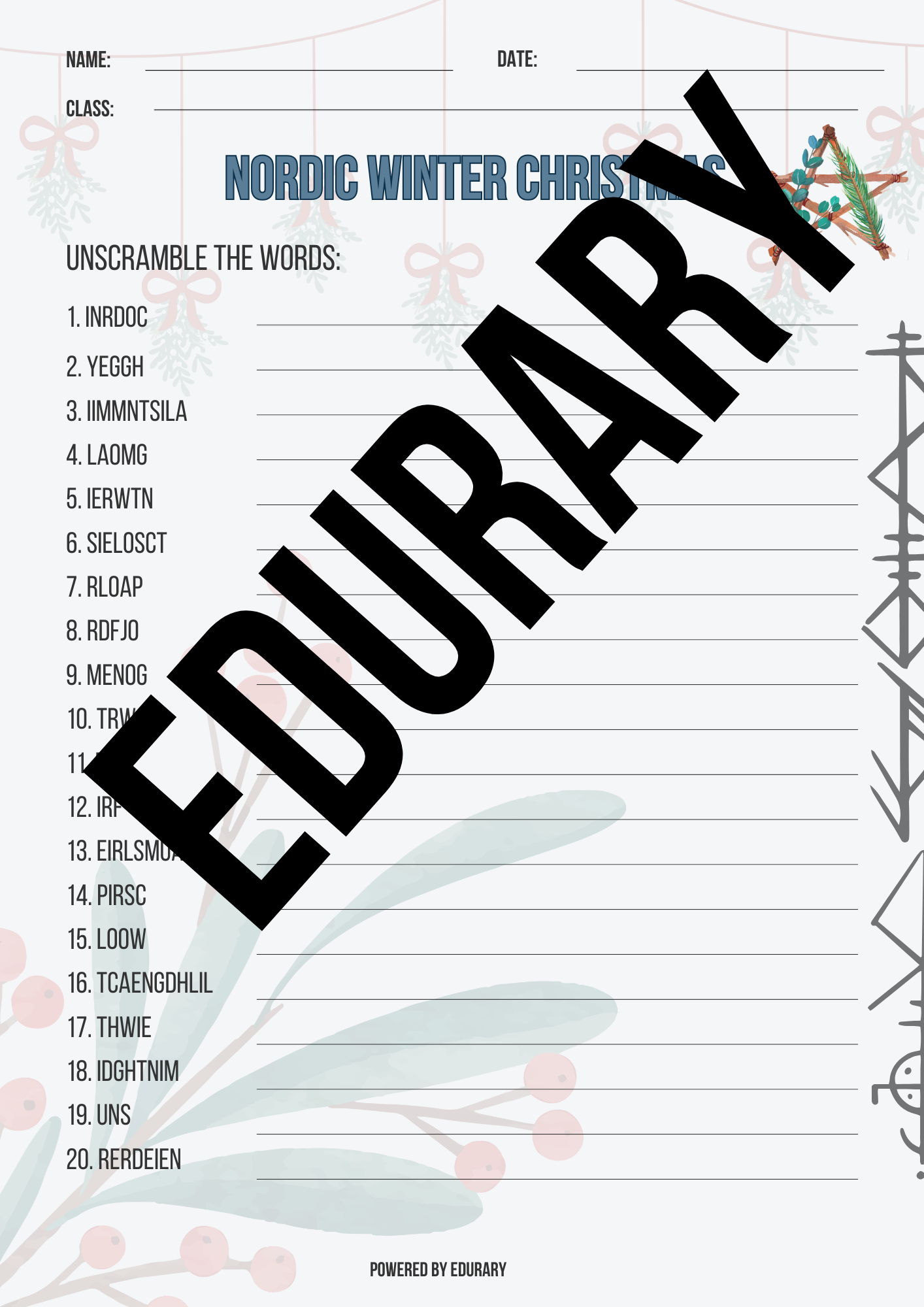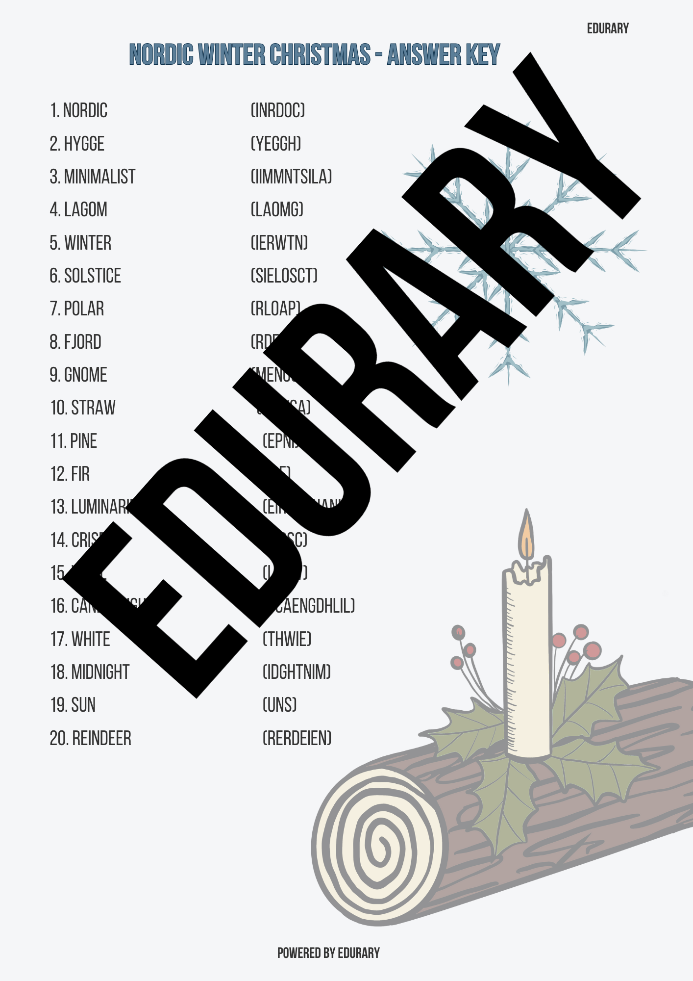 Words that convey the minimalist elegance, natural light, and hygge (cozy contentment) of a Nordic or Scandinavian Christmas and winter season.